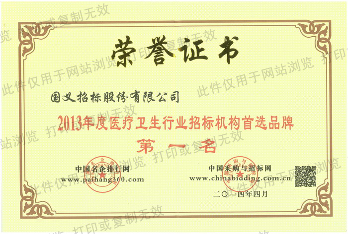 2013年度醫(yī)療衛(wèi)生行業(yè)招標(biāo)機(jī)構(gòu)首選品牌第一名