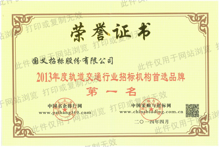 2013年度軌道交通行業(yè)招標(biāo)機(jī)構(gòu)首選品牌第一名