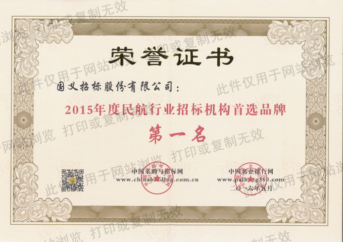 2015年度中國(guó)民航行業(yè)招標(biāo)機(jī)構(gòu)首選品牌第一名
