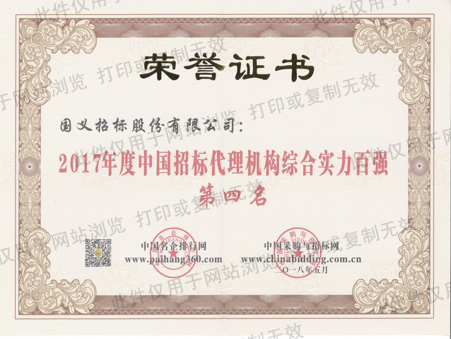 2017年度中國(guó)招標(biāo)代理機(jī)構(gòu)綜合實(shí)力百?gòu)?qiáng)第四名
